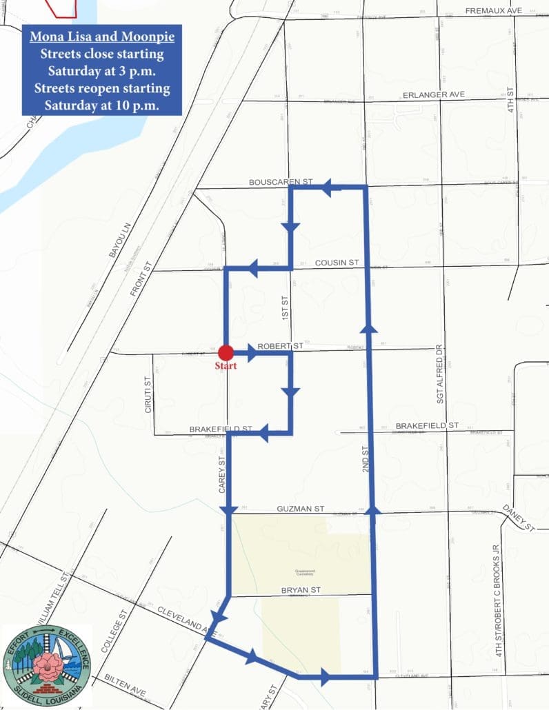For the Mona Lisa and Moonpie Parade, most of Olde Towne will be closed starting Saturday at 3 p.m. and reopening Saturday starting at 10 p.m. See the map for more details.