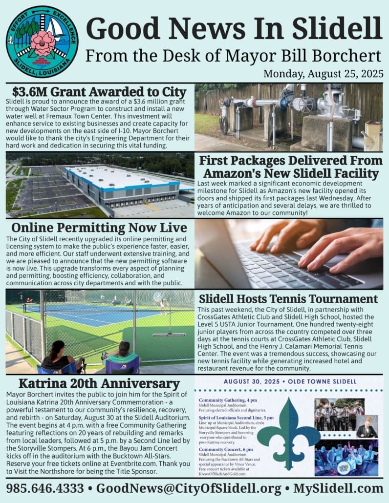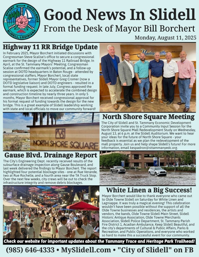 For more information about City of Slidell news and events, visit the city’s website at MySlidell.com and follow the “City of Slidell, Louisiana” on Facebook and Instagram.