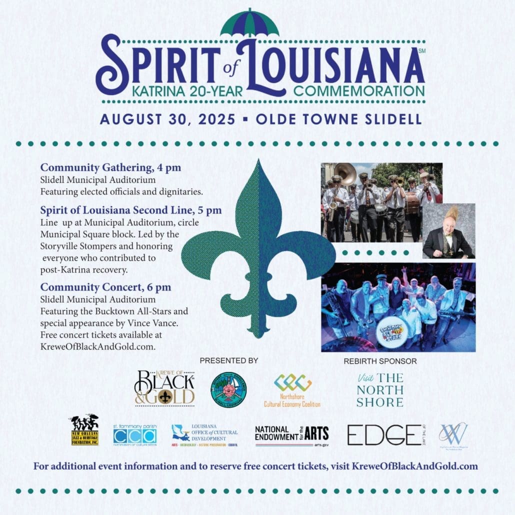 Now, two decades later, relentless resilience and commitments to recovery have paved the way to the rebirth of the tattered city. To commemorate the milestone anniversary of the storm, the Krewe of Black & Gold, a local non-profit organization, has partnered with the City of Slidell and Northshore Cultural Economy Coalition to present “The Spirit of Louisiana Katrina 20 Commemoration.” The three-part event will begin on Saturday, August 30 at 4 p.m. in the Slidell Municipal Auditorium. The ceremony will acknowledge the losses that so many have suffered plus the efforts of all the recovery workers and volunteers who contributed to rebuilding the city. Featured speakers will include Slidell Mayor Bill Borchert and former Mayor Ben O. Morris, Parish President Michael Cooper and past-President Kevin Davis.