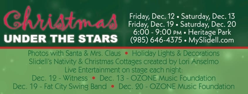 “Christmas Under the Stars is one of Slidell’s most beloved traditions, and I’m excited to welcome everyone to Heritage Park this year for some holiday cheer,” said Slidell Mayor Randy Fandal. “This event brings families, friends, and neighbors together to celebrate the joy of the season, and I encourage everyone to come out, enjoy the lights and music, and make special holiday memories right here in Slidell.”