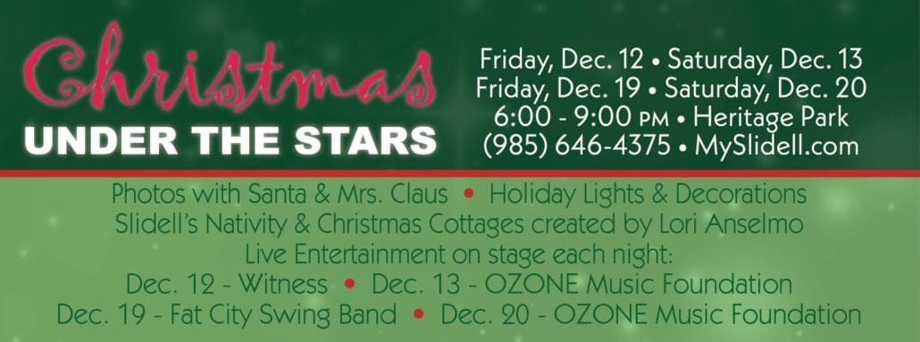 “Christmas Under the Stars is one of Slidell’s most beloved traditions, and I’m excited to welcome everyone to Heritage Park this year for some holiday cheer,” said Slidell Mayor Randy Fandal. “This event brings families, friends, and neighbors together to celebrate the joy of the season, and I encourage everyone to come out, enjoy the lights and music, and make special holiday memories right here in Slidell.”