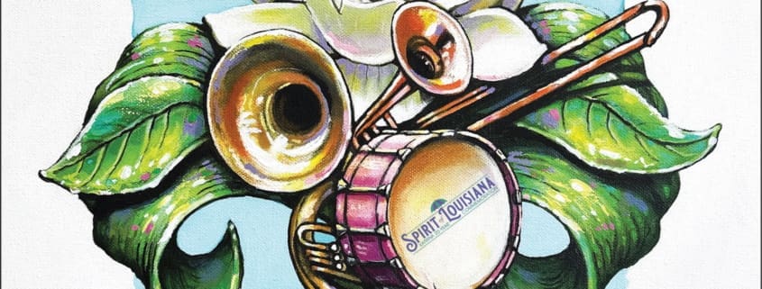 The work features Sambola’s signature RedBean the Crawfish preparing for the Spirit of Louisiana Second Line with brass instruments and Louisiana’s state flower, the magnolia, atop a leafy green fleur de lis with a backdrop of Katrina floodwaters.