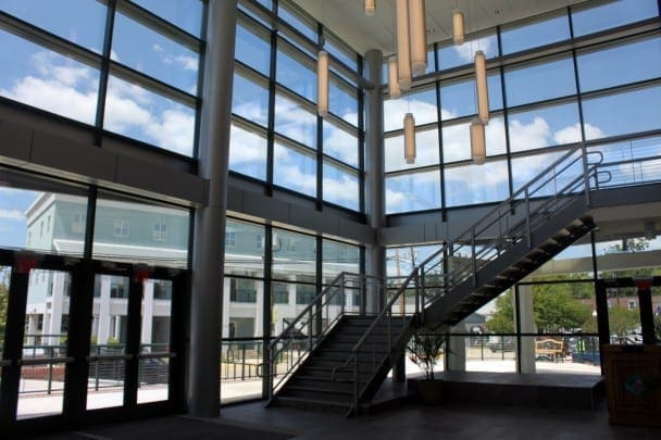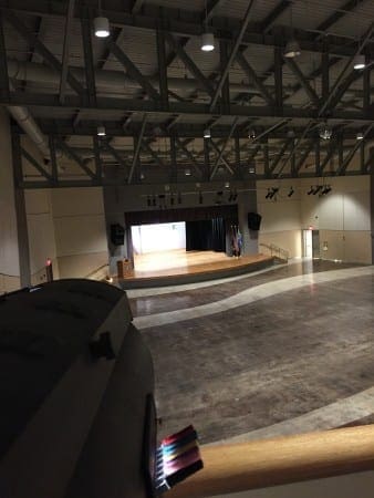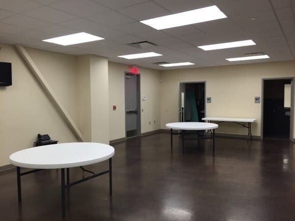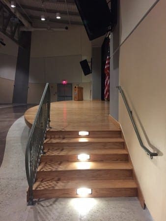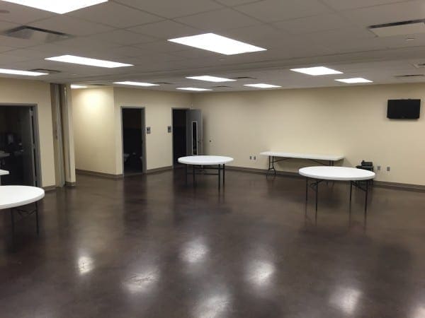 A floor plan is available that shows the 10,000 square feet of usable space, including a stage area and main hall and a large glass enclosed lobby.