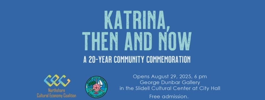 To commemorate the milestone 20th Anniversary of Hurricane Katrina, Northshore Cultural Economy Coalition presents “Katrina, Then and Now: a 20-Year Community Commemorative Exhibition,” to be hosted by the City of Slidell in the George Dunbar Gallery in City Hall, with an opening reception on Friday, August 29 from 6 to 8 pm. Admission is free.