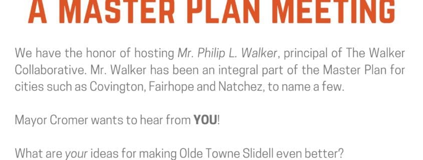 The City of Slidell and Olde Towne Slidell Main Street will host a Public Meeting to discuss a Master Plan for Olde Towne Slidell on Thursday, February 17 starting at 5:30 p.m. at the Slidell Municipal Auditorium.