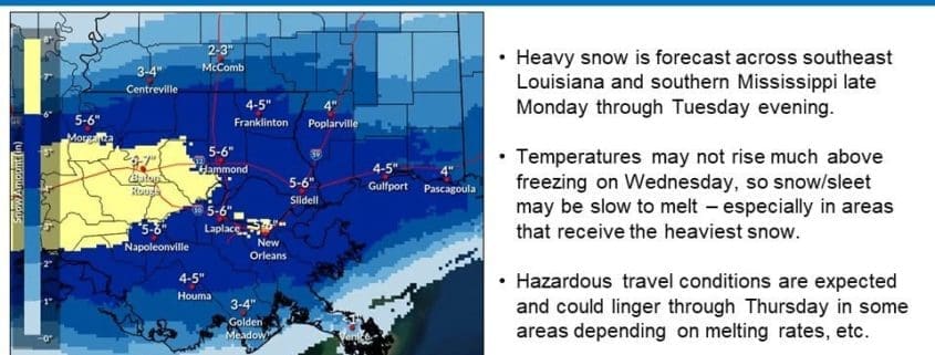 Slidell is currently under a Winter Storm Warning, and we are anticipating significant impacts from this weather event. The forecast predicts 4 to 8 inches of snow on Tuesday, with temperatures dropping below freezing every night this week.