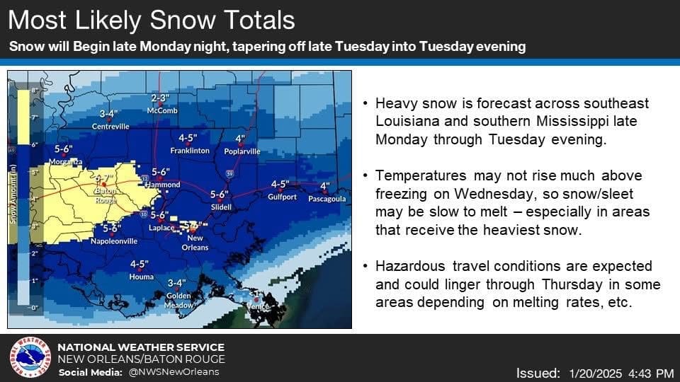 Slidell is currently under a Winter Storm Warning, and we are anticipating significant impacts from this weather event. The forecast predicts 4 to 8 inches of snow on Tuesday, with temperatures dropping below freezing every night this week.