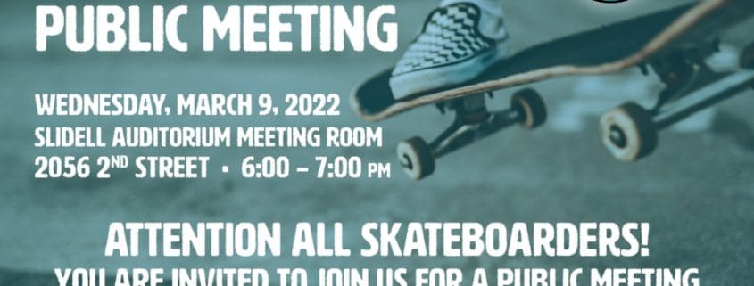 The City of Slidell is hosting a Public Meeting for a proposed skate park in Slidell on Wednesday, March 9, from 6 to 7 p.m. at the Slidell Municipal Auditorium Meeting Room, located at 2056 Second Street in Olde Towne Slidell.