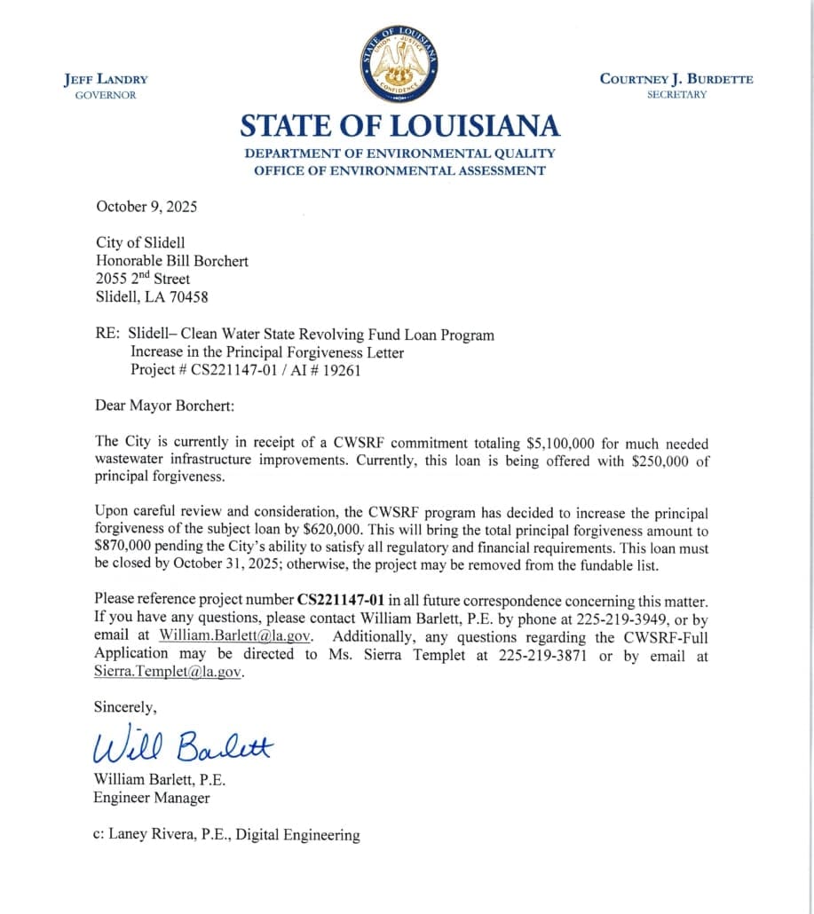 On October 9, Slidell Mayor Bill Borchert received a letter notifying the city that the principal forgiveness amount has increased to $620,000, bringing the total to $870,000. This means that a larger portion of the city’s loan will not need to be repaid, reducing the overall cost to local taxpayers.