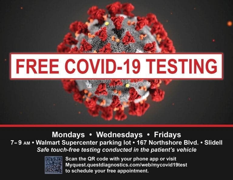 Starting on Friday, June 19, free COVID-19 tests will be available in Slidell in the Walmart Supercenter parking lot (located at 167 Northshore Blvd.) and will be conducted is a safe, touch-free environment in the patient’s vehicle. Testing will take place on Monday, Wednesday and Friday mornings from 7 to 9 a.m. until further notice. Testing is free and patients must schedule an appointment at https://myquest.questdiagnostics.com/web/mycovid19test to secure a time for their test.