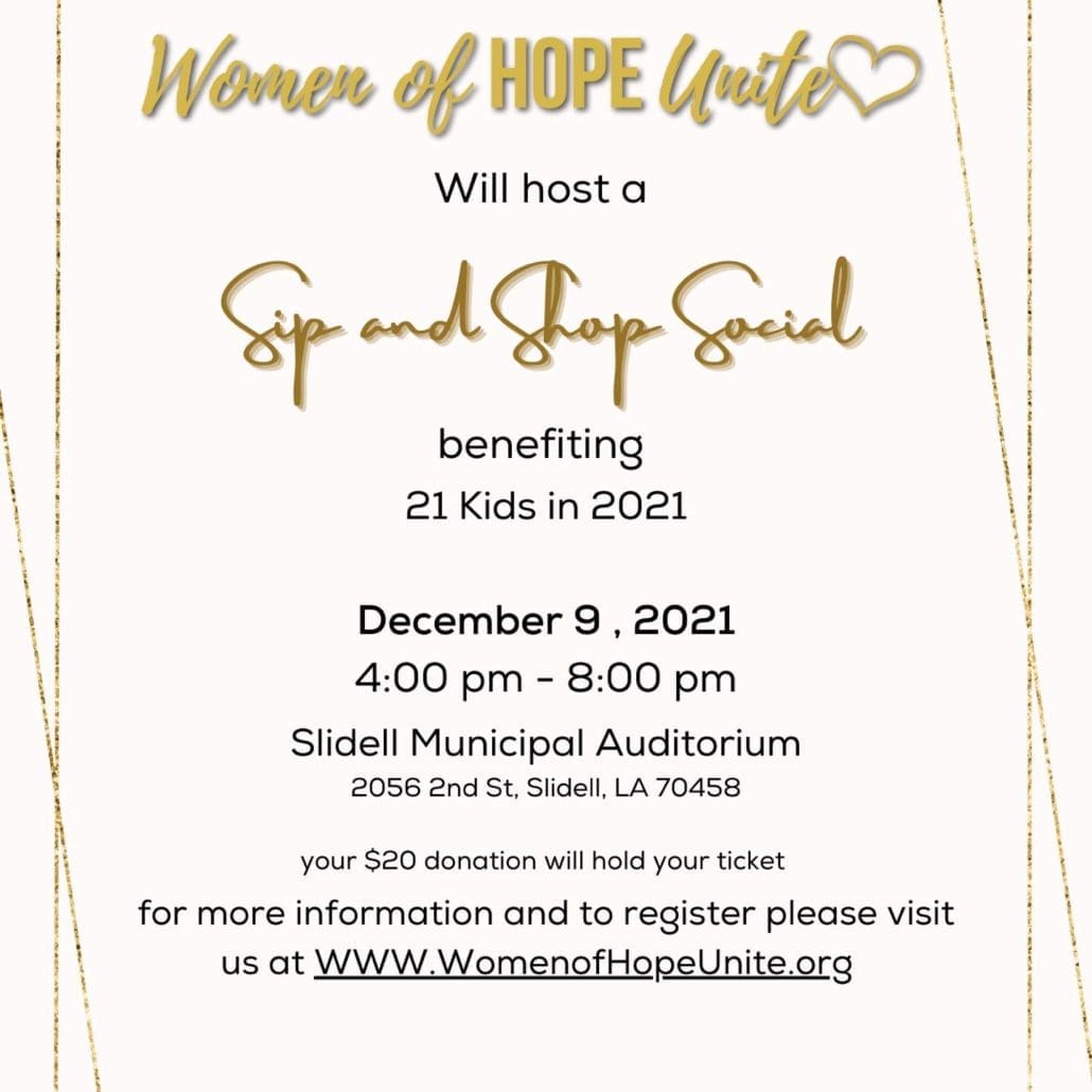 Mayor Cromer would like to invite you to attend the Women of Hope Unite Sip and Shop Social on Friday, Dec. 9, from 4 to 8 pm at the Slidell Municipal Auditorium.