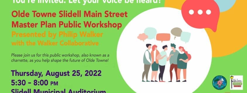 “Olde Towne Slidell is the heart of our city and is great place to live, work and play. It’s important that the public attend this meeting and tell us their thoughts on how the City and Main Street can improve and make Olde Towne Slidell an even better place for our community,” said Slidell Mayor Greg Cromer. “I encourage all the Olde Towne organizations, residents, business owners and members of the public to attend this important meeting.”